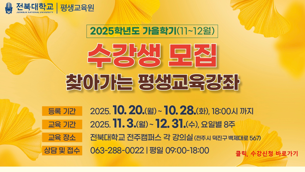 fnctId=imageSlide,fnctNo=601 비쥬얼존(1 개) 열린대학, 꿈이 있는대학, 지역민의 대학 전북대학교 평생교육원 로그인 수강신청 안내 교육과정 바로가기 교육문의 063)288-0022 fnctId=recentBbs,fnctNo=740 2026학년도 1학기 신규강좌 신청 안내 새글 10.22 찾아가는 평생교육강좌 수강생 모집-2025학년도 2학기 11~12월(8주) 새글 10.20 2025학년도 2학기 과정별 강의실 안내 08.28 2025학년도 2학기(9~10월, 8주) 찾아가는 평생교육강좌 수강생 모집 08.04 2025학년도 2학기(가을) 수강생 모집 안내 07.25 더보기 fnctId=recentBbs,fnctNo=741 2차 인증 도구 사용 방법 안내(구글 OTP 적용 보안 강화) 09.02 [전북대 구성원] 회원가입 및 감면혜택 적용 방법 안내 02.02 회원가입 안내 02.02 신설강좌 개설 제안서(이력서, 강의계획서, 개인정보동의서 등) 04.19 강의계획서 입력 방법 12.23 더보기 fnctId=recentBbs,fnctNo=2474 [대학저널] 전북대 평생교육원, 지역민 위한 헬스케어 아카데미 운영 출처 : 대학저널(https://dhnews.co.kr) 새글 12.23 [베리타알파 교육전문신문] 전북대 평생교육원 지역민 위한 헬스케어 아카데미 운영 새글 12.23 [전북도민일보] 2024학년도 2학기 수강생 모집 08.09 [한국강사신문] 전북대학교 평생교육원, 2024학년도 1학기 수강생 모집 02.05 [전북중앙] 전북대 평생교육원, 1학기 수강생 모집... 16일 마감 02.05 더보기